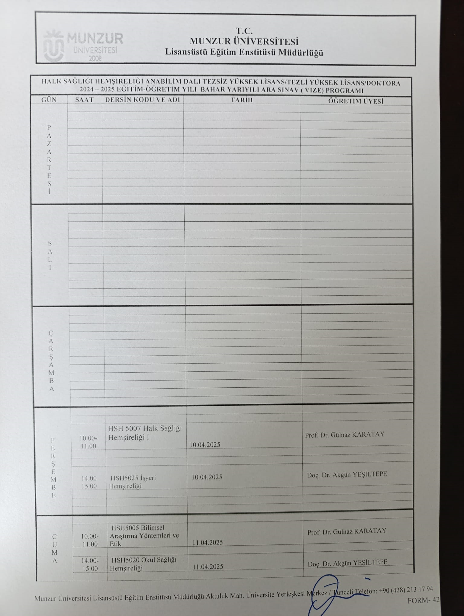 2024-2025 Öğretim Yılı Bahar Yarıyılı Halk Sağlığı Hemşireliği Ara Sınav Programı