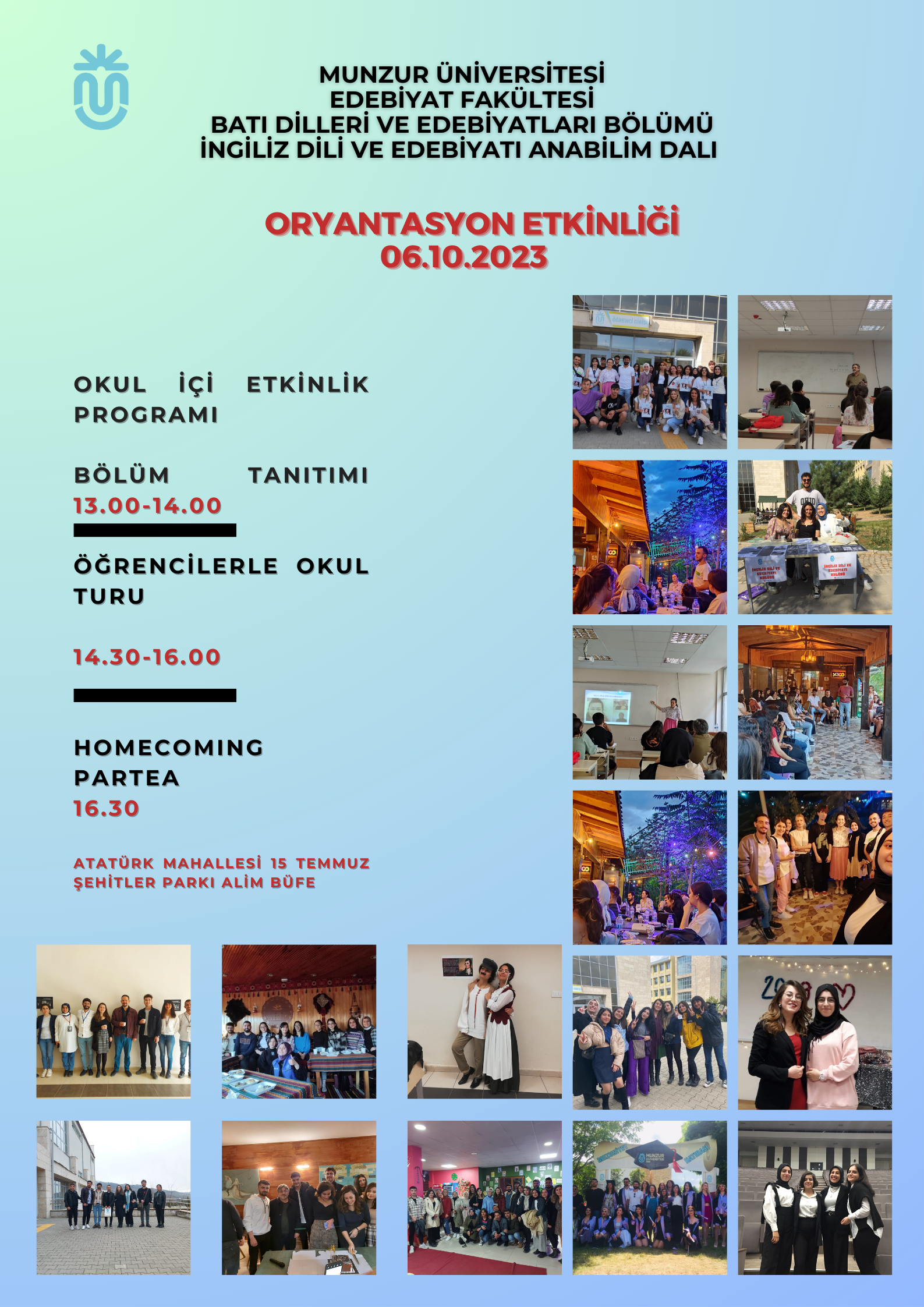 2023-2024 Akademik Yılında bölümümüze yeni gelen 1. sınıf öğrencileri için düzenlenecek olan Oryantasyon programımız 6 Ekim 2023 Cuma günü gerçekleştirilecektir.