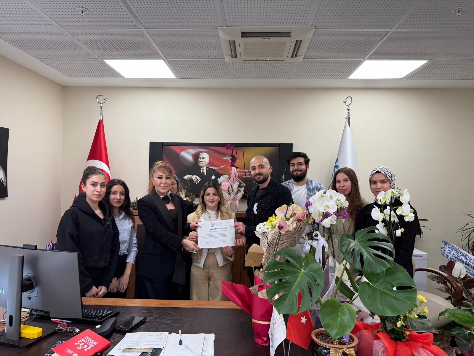 After the event, our esteemed dean, Prof. Dr. Ülkü ÖZBEY, welcomed the Social Work Society which is part of our department, to her office and presented the club with a certificate of appreciation for their contribution to the event and took a commemorative photo with them.