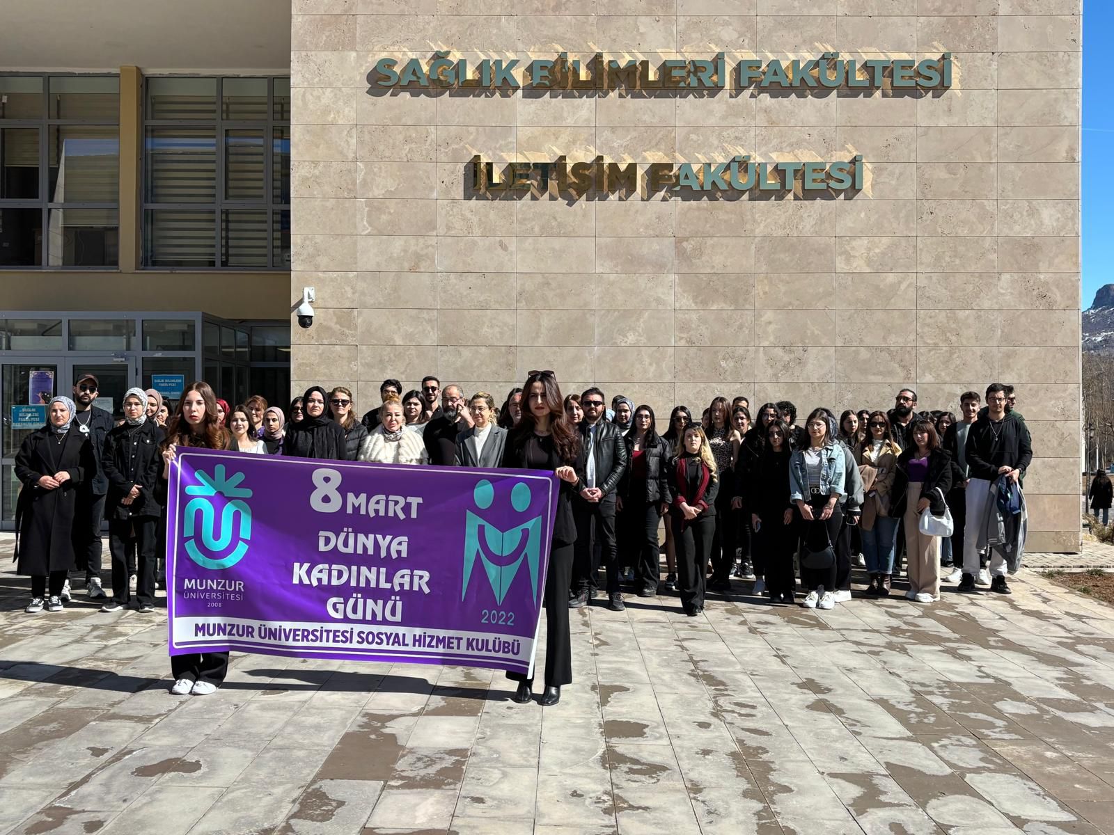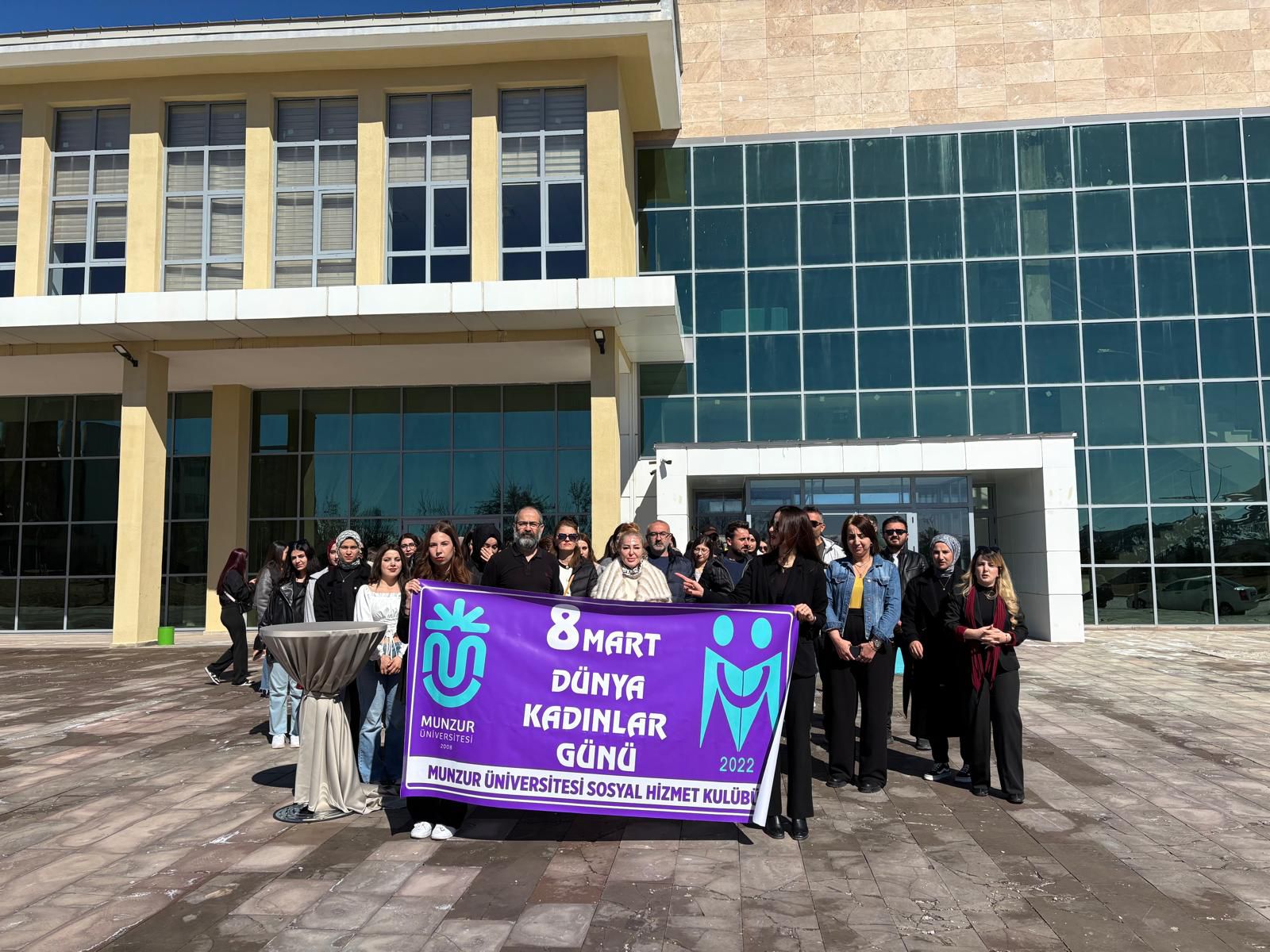 As part of International Women's Day on March 8, our department's community held an International Women's Day Event. The event began with a statement made in front of the Congress Culture Center. Speaking at the announcement were Prof. Dr. Ülkü ÖZBEY, Dean of the Faculty of Health Sciences at Munzur University; Assoc. Prof. Dr. Servet GÜN, Head of the Social Work Department at the Faculty of Health Sciences at Munzur University; and Ali Berhan SOYLU, President of the Social Work Club, who delivered speeches emphasizing the meaning and importance of the day.