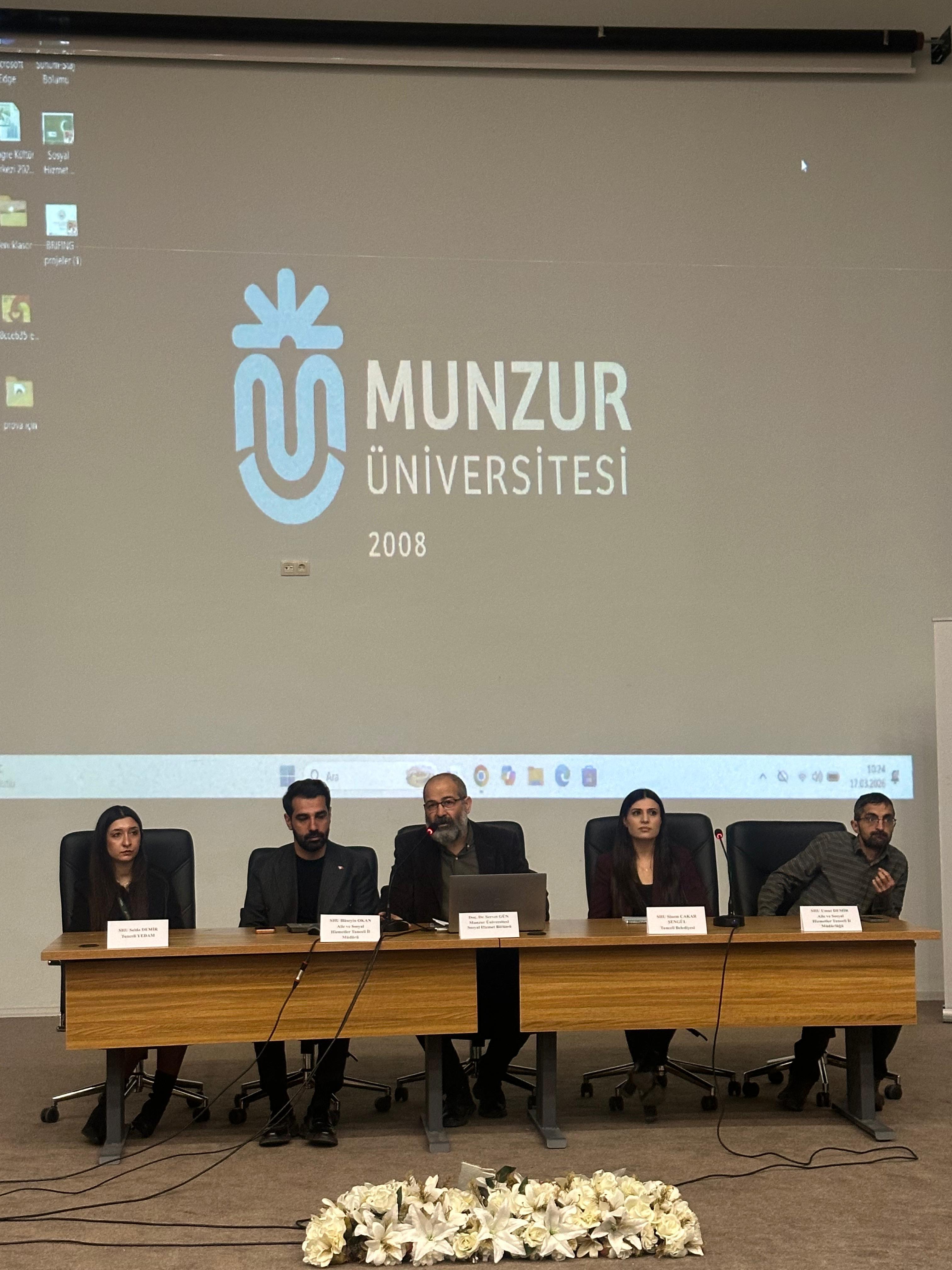 As part of our panel, we were joined by our external stakeholders: Mr. Hüseyin OKAN, Provincial Director of the Ministry of Family and Social Services in Tunceli, and SW Umut Demir; SW Selda DEMİR from Tunceli YEDAM (Yeşilay Counseling Center); and SW Sinem ÇAKAR ŞENGÜL from Tunceli Municipality, and moderated by our department chair, Assoc. Prof. Dr. Servet GÜN. Our participants highlighted the social work practices carried out by institutions in Tunceli and emphasized the social service opportunities available in the region.