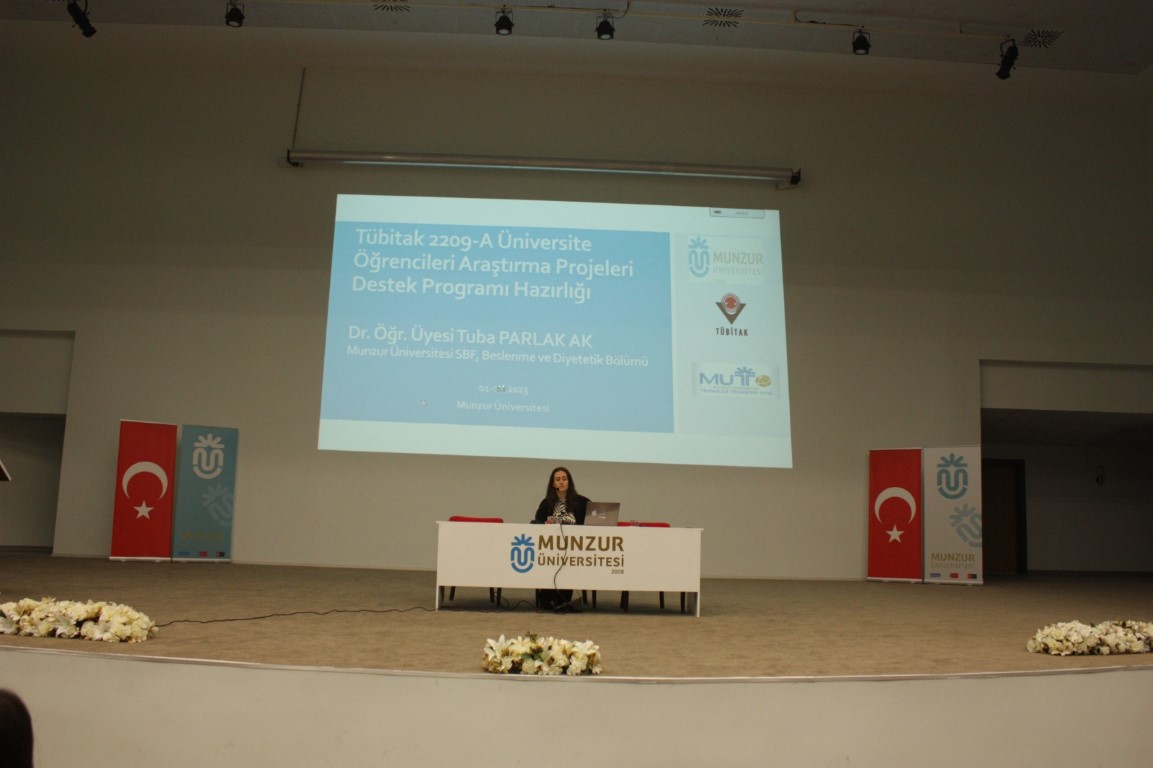 Eğitim kapsamında Munzur Üniversitesi Sağlık Bilimleri Fakültesi Beslenme ve Diyetetik Bölümü öğretim üyelerinden Dr. Öğr. Üyesi Tuba Parlak Ak öğrencilerimiz ile buluştu. Üniversitemiz Kongre Kültür Merkezinde gerçekleştirilen etkinliğe Rektör Yardımcımız Prof. Dr. Nuran Cıkcıkoğlu Yıldırım, akademik personeller ve öğrencilerimiz katılım sağladı. Eğitimde Dr. Öğr. Üyesi Tuba Parlak Ak yaptığı sunumda 2209 proje hazırlama süreci, proje yazım süreci, bilimsel araştırma ve hipotez, özgün değer, amaç ve hedefler, yöntem, yönetim ve yaygın etki, bütçe ve gerekçesi, özet ve anahtar kelimeler, projelerde yapılan hatalar ve değerlendirme süreçlerine ilişkin bilgileri aktarırken TÜBİTAK projelerinin kabulünde önemli etkileri olan kriterlere de yer verdi. Program Rektör Yardımcımız Prof. Dr. Nuran Cıkcıkoğlu Yıldırım’ın Dr. Öğr. Üyesi Tuba Parlak Ak’a teşekkür belgesi vermesi ile son buldu.