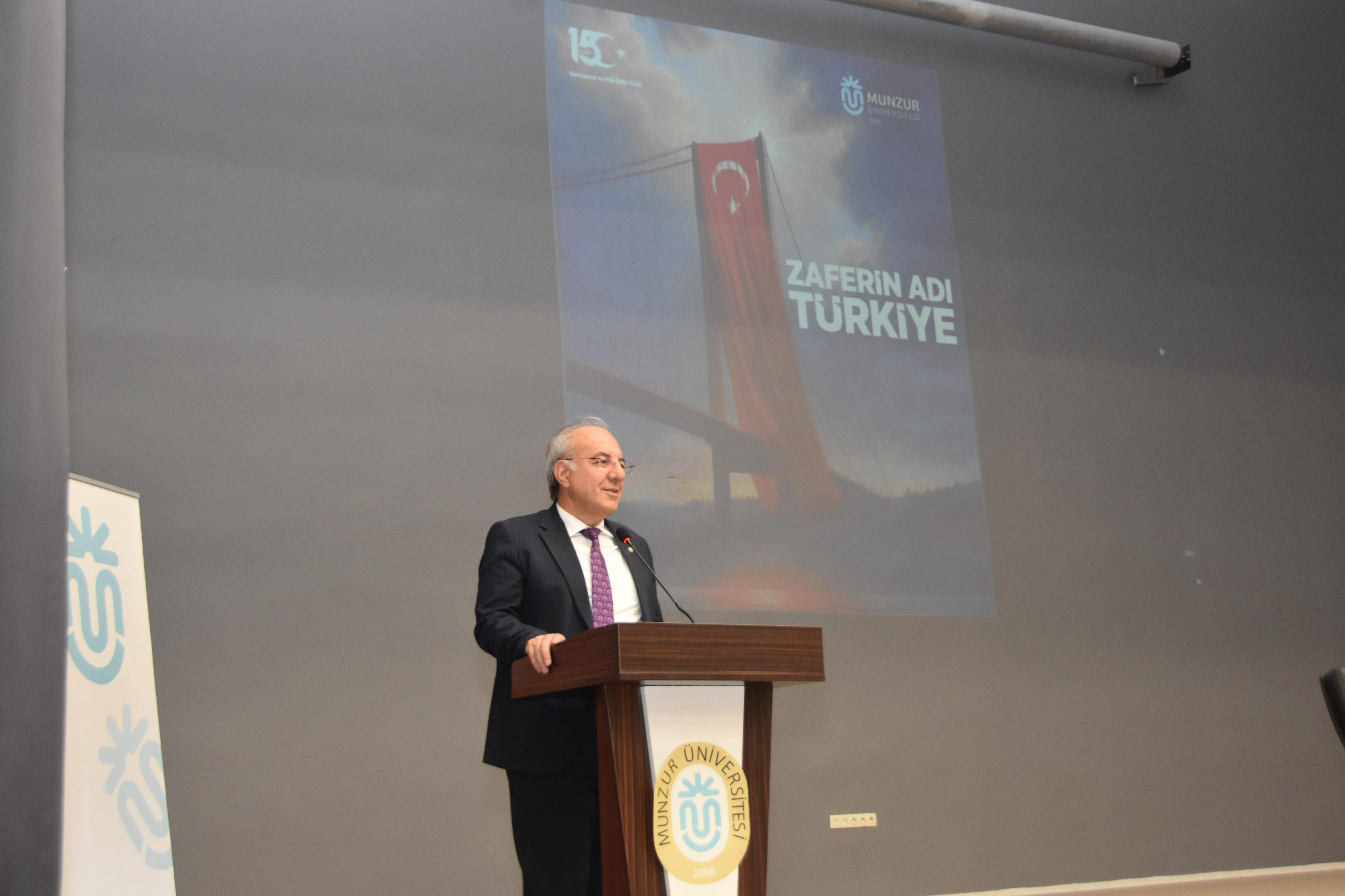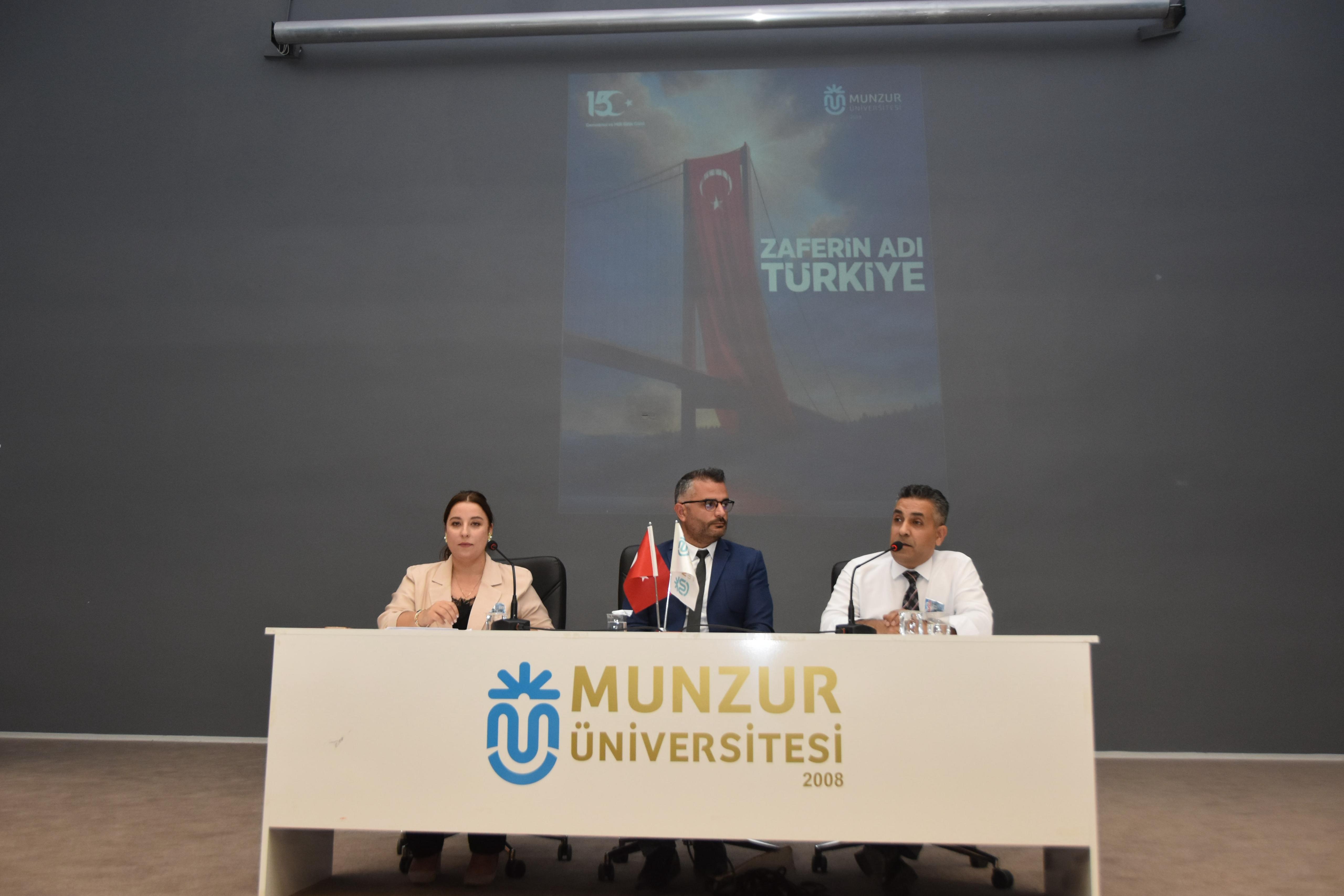 Munzur Üniversitesi Kongre Kültür Merkezi’nde, 15 Temmuz Demokrasi ve Millî Birlik Günü kapsamında “Geçmişten Günümüze Darbeler ve Türk Demokrasisi” başlıklı bir konferans düzenlendi. Konferans, 16 Temmuz saat 14.00’te başladı. “15 Temmuz Milletin Zaferi” temalı fotoğraf sergisi gezisiyle başlayan etkinliğin açılış konuşmasında Rektörümüz Prof. Dr. Kenan PEKER, 15 Temmuz’un milletin birlik ve beraberlik ruhunu yansıttığını vurguladı ve 15 Temmuz 2016 gecesinde bağımsızlığımız uğruna şehit düşen tüm kahramanlarımızı rahmet ve minnetle yad etti. Moderatörlüğünü Doç. Dr. Harun KORUNUR'un üstlendiği konferansta Doç. Dr. Ela ÖZKAN ve Doç. Dr. Şahin YEDEK konuşmacı olarak yer aldı. Yapılan konuşmalarda darbe konularına vurgu yapılmakla beraber, milletimizin demokrasiye ve milli iradeye sahip çıkma kararlılığına da dikkat çekildi.