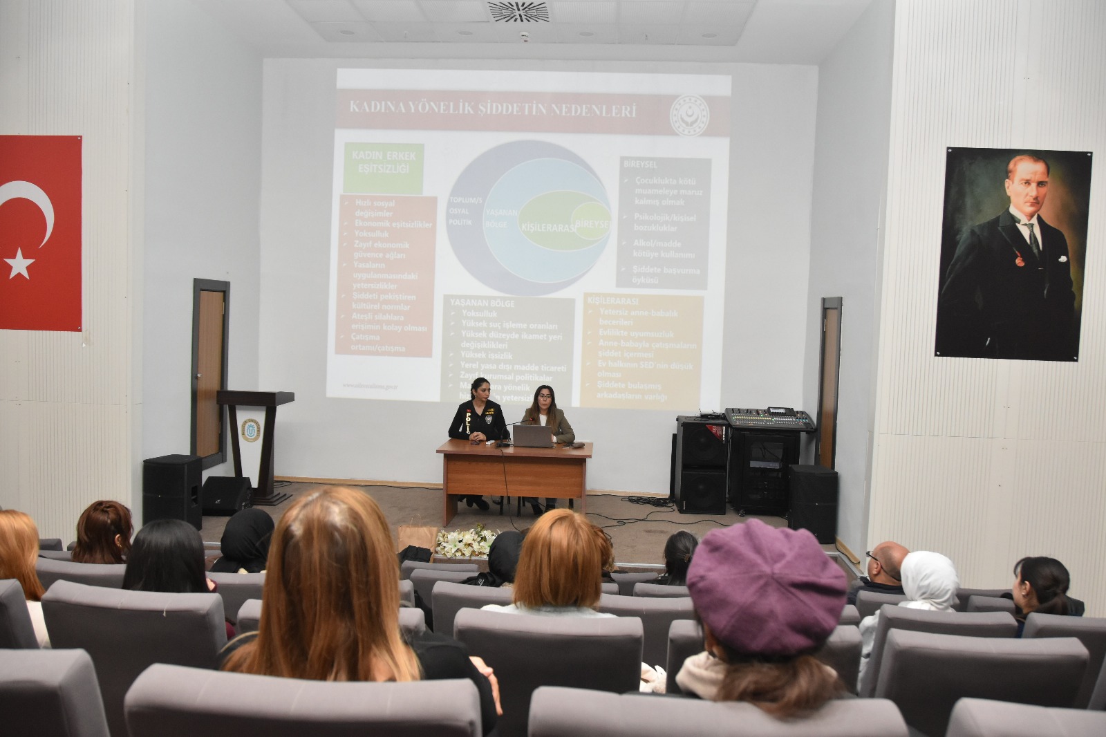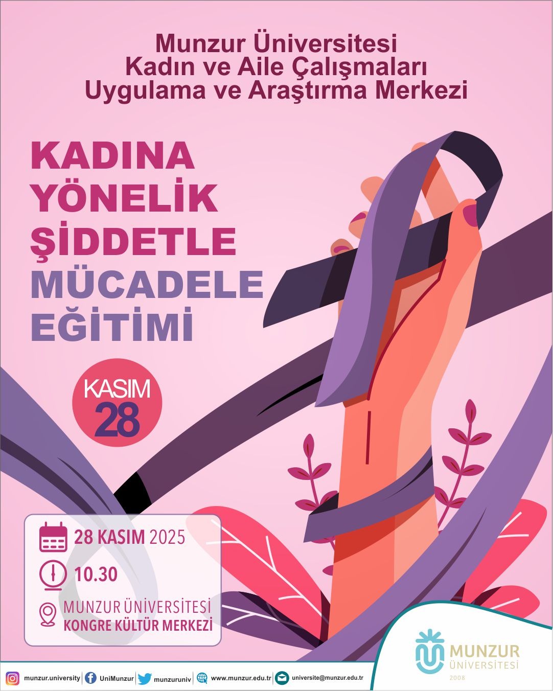 28 Kasım 2025 Cuma günü saat 10:30'da Munzur Üniversitesi Kongre ve Kültür Merkezi'ndeMunzur Üniversitesi Kadın ve Aile Çalışmaları Uygulama ve Araştırma Merkezi ile birlikte Tunceli Aile ve Sosyal Hizmetler İl Müdürlüğü eğitmeni Zeynep Sınacı tarafından Kadına Yönelik Şiddetle Mücadele Eğitimi düzenlenmiştir.
