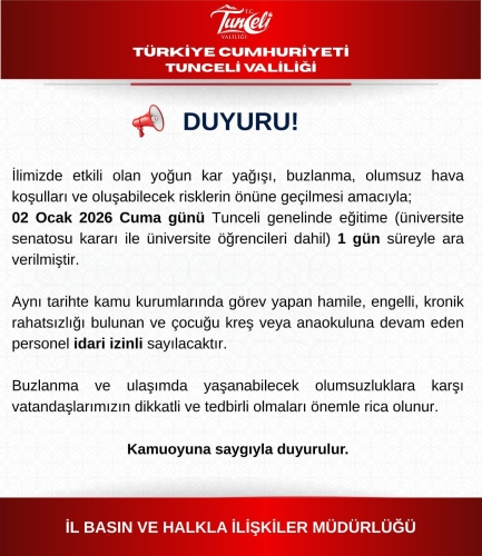 Tunceli Valiliği tarafından yayınlanmış olan 01 Ocak 2026 tarihli duyuru ile yoğun kar yağışı, buzlanma, olumsuz hava koşulları ve oluşabilecek risklerin önüne geçilmesi amacıyla 02 Ocak 2026 Cuma günü Tunceli genelinde eğitime (üniversite senatosu kararı ile üniversite öğrencileri dahil) 1 gün süreyle ara verilmiştir.