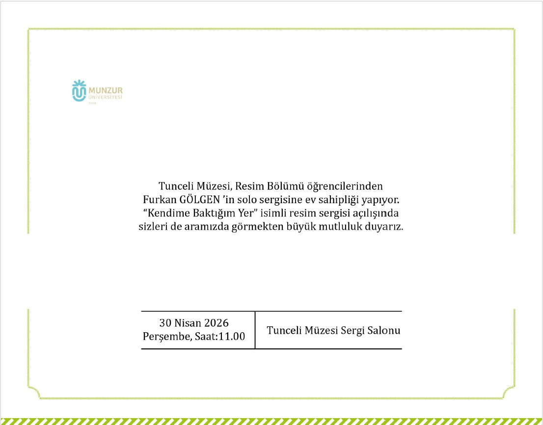 Bölümümüz IV. sınıf öğrencilerinden Furkan GÖLGEN ’in 30 Nisan-10 Mayıs 2026 tarihleri arasında Tunceli Müzesi sergi salonunda "Kendime Baktığım Yer" başlıklı kişisel sergisi sanat severleri bekliyor.