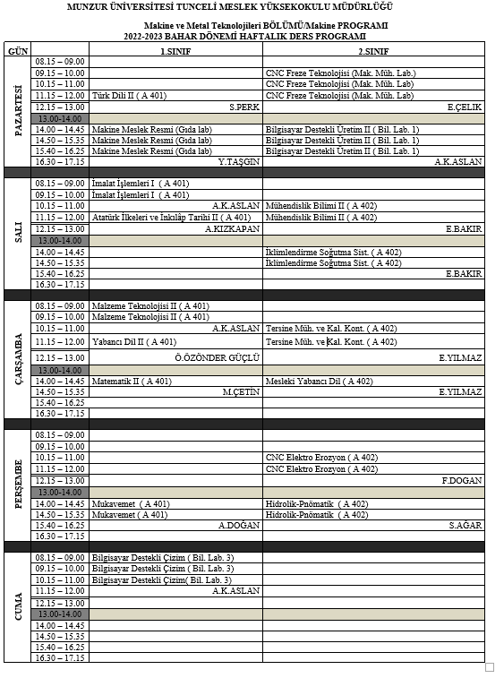 2022-2023 Makine Bölüm Bahar yarıyılı Ders Programı |