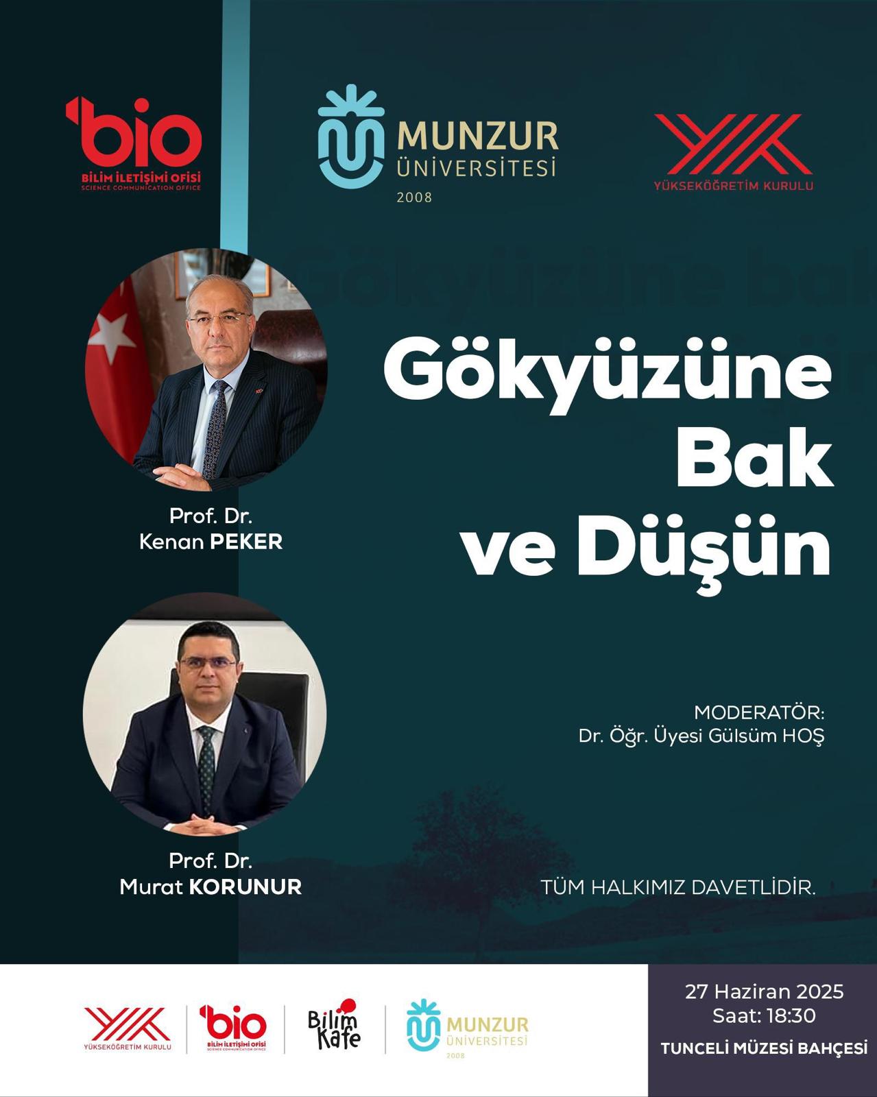 YÖK’ün bilimi değere dönüştüren yolculuğunda Bilim İletişim Ofisleri (BİO) tarafından 81 ilde etkinlikler organize edildi. Üniversitemiz Rektörü Prof. Dr. Kenan PEKER, İhtisaslaşma Koordinatörü Prof. Dr. Murat KORUNUR, akademisyenlerin ve vatandaşların katıldıkları “Gökyüzüne Bak ve Düşün” konulu Bilim Kafe Buluşması Tunceli Müzesi’nde gerçekleştirildi. Toplumun her kesiminden katılımcıların iletişimin ilkeleri, prensipleri, teknikleri ve teknolojilerini kullanılarak “gökyüzüne bak ve düşün” sohbeti iyi bir etkileşimle “birlikte berekete” dönüştü. Etkinliğin “BİO güç” arayışı ve bunun bölgesel gelişme uygulamaları konusunda orijinal fikirler üretildi.