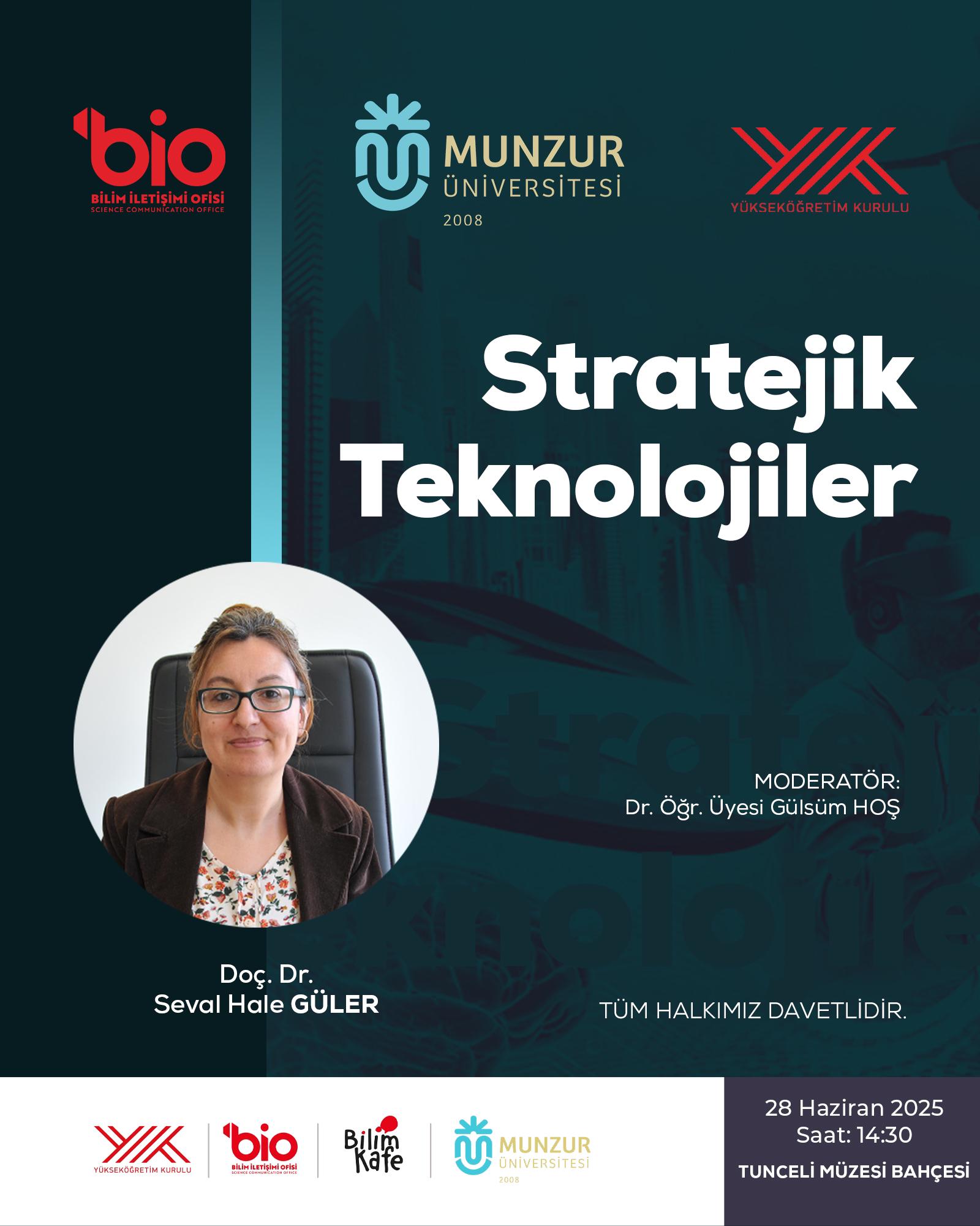 YÖK koordinasyonunda 27-28 Haziran 2025 tarihlerinde düzenlenen Bilim Kafe etkinliklerinin ikinci gününde Doç. Dr. Seval Hale GÜLER, "Stratejik Teknolojiler" konusu ele alındı. Tunceli Müzesi’nde gerçekleşen söyleşide savunma sanayi, yapay zekâ, veri güvenliği ve ileri teknoloji gibi birçok başlıkta verimli sohbetler yapıldı. Akademisyenler ve vatandaşların bir araya geldiği etkinlikte, katılımcılarla karşılıklı etkileşim sağlandı. Munzur Üniversitesi’nin Araştırma Merkezi (MUNTEAM)’in stratejik teknolojilere önemli katkılar sağlayabileceği vurgulandı.