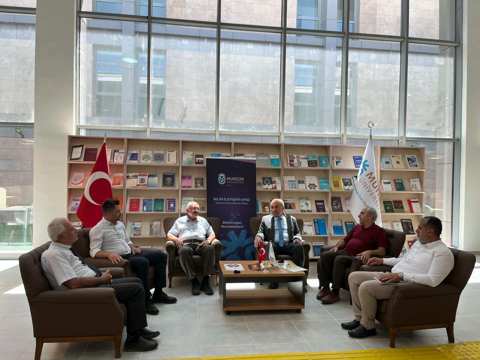 Munzur Üniversitesi Bilim İletişim Ofisi (MU BİO) öncülüğünde, bilimi toplumla buluşturmayı amaçlayan “Bilim Kafe Etkinlikleri” kapsamında düzenlenen “Eğitimci Yazarlık” söyleşisi, 2 Temmuz 2025 tarihinde Munzur Üniversitesi Kütüphanesi’nde gerçekleştirildi. Etkinliğe Rektörümüz Prof. Dr. Kenan PEKER’in yanı sıra, Fırat Üniversitesi'nden Dr. Öğr. Üyesi Naci ONUR, Öğr. Gör. Recep BAĞCI, Manas Yayıncılık Genel Koordinatörü M. Şener BULUT, Sarı Saltık Ocağı dedelerinden Ali Ekber YURT ve Öğr. Gör. Muhammet Faruk EKİCİ katıldı. Eğitimci yazarlık konusunda ufuk açıcı sohbetlerin gerçekleştiği bu buluşmada, bilimin topluma daha güçlü bir şekilde ulaşması ve iş birliği sürecinin geliştirilmesi hedeflendi.