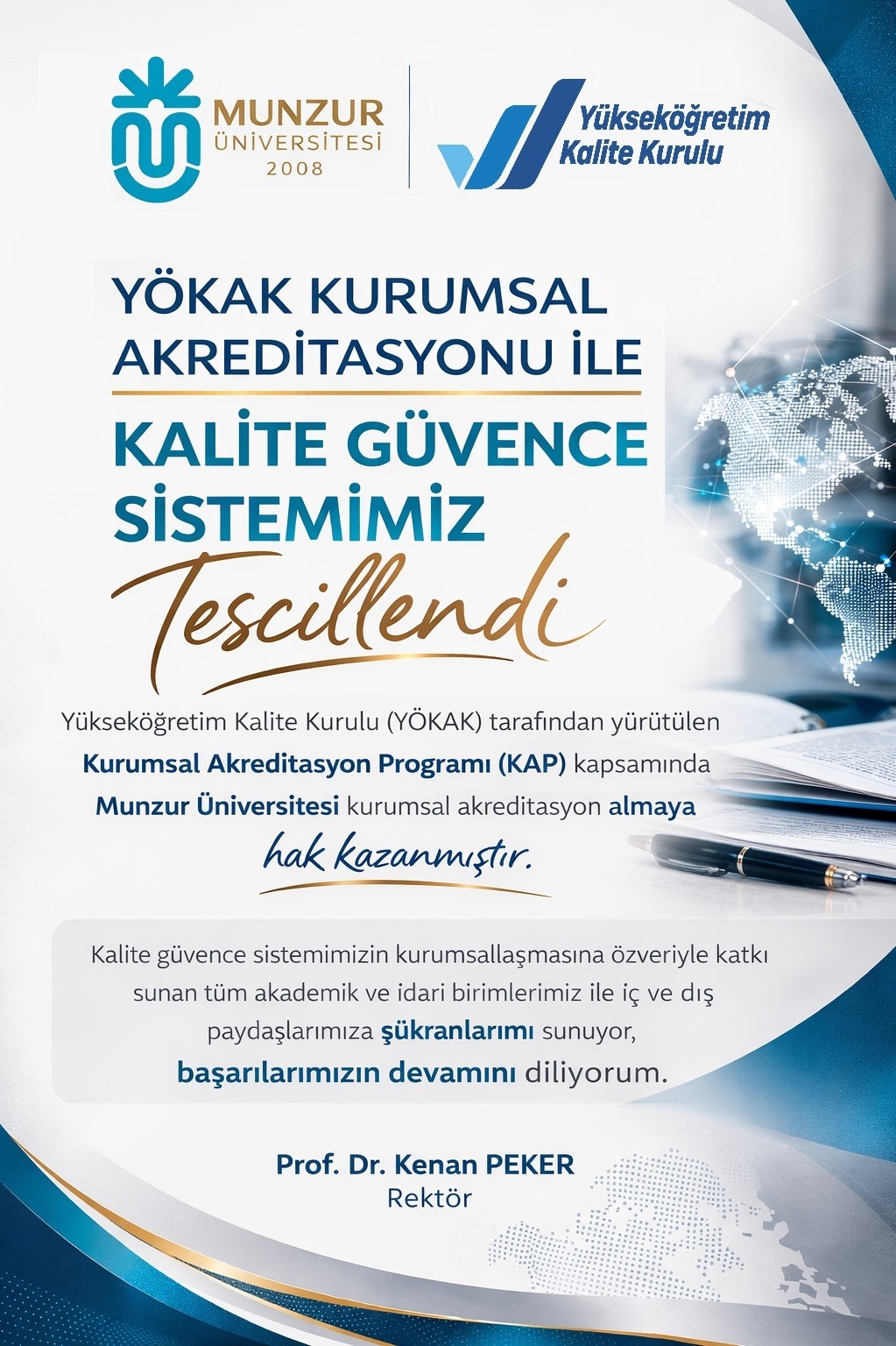 YÖKAK tarafından Mart 2026 tarihinde gerçekleştirilen kurul toplantısında alınan karar doğrultusunda Türkiye genelinde toplam 39 üniversite Kurumsal Akreditasyon Programı kapsamında değerlendirilirken, Munzur Üniversitesi de kalite güvencesi sistemlerini geliştirme yönünde yürüttüğü çalışmalar sonucunda akreditasyon almaya hak kazanan üniversiteler arasında yer aldı. Bu gelişmeyle birlikte Munzur Üniversitesi, yükseköğretimde kalite kültürünün yaygınlaştırılması ve sürdürülebilir bir kalite yönetim sisteminin güçlendirilmesi hedefi doğrultusunda önemli bir adım daha atmıştır. Munzur Üniversitesi, kalite güvencesi sistemi doğrultusunda yürüttüğü çalışmalarla kurumsal kapasitesini güçlendirmeyi sürdürürken; eğitim-öğretim süreçlerinin geliştirilmesi, araştırma faaliyetlerinin desteklenmesi ve toplumsal katkının artırılması yönündeki çalışmalarına kararlılıkla devam etmektedir. Bu kapsamda elde edilen bu başarı, Munzur Üniversitesi’nin kalite odaklı yönetim anlayışının ve sürekli iyileştirme yaklaşımının önemli bir göstergesi olarak değerlendirilmektedir. Üniversitemizin elde ettiği bu anlamlı başarıya katkı sağlayan tüm akademik ve idari personelimiz ile paydaşlarımıza teşekkür ederiz