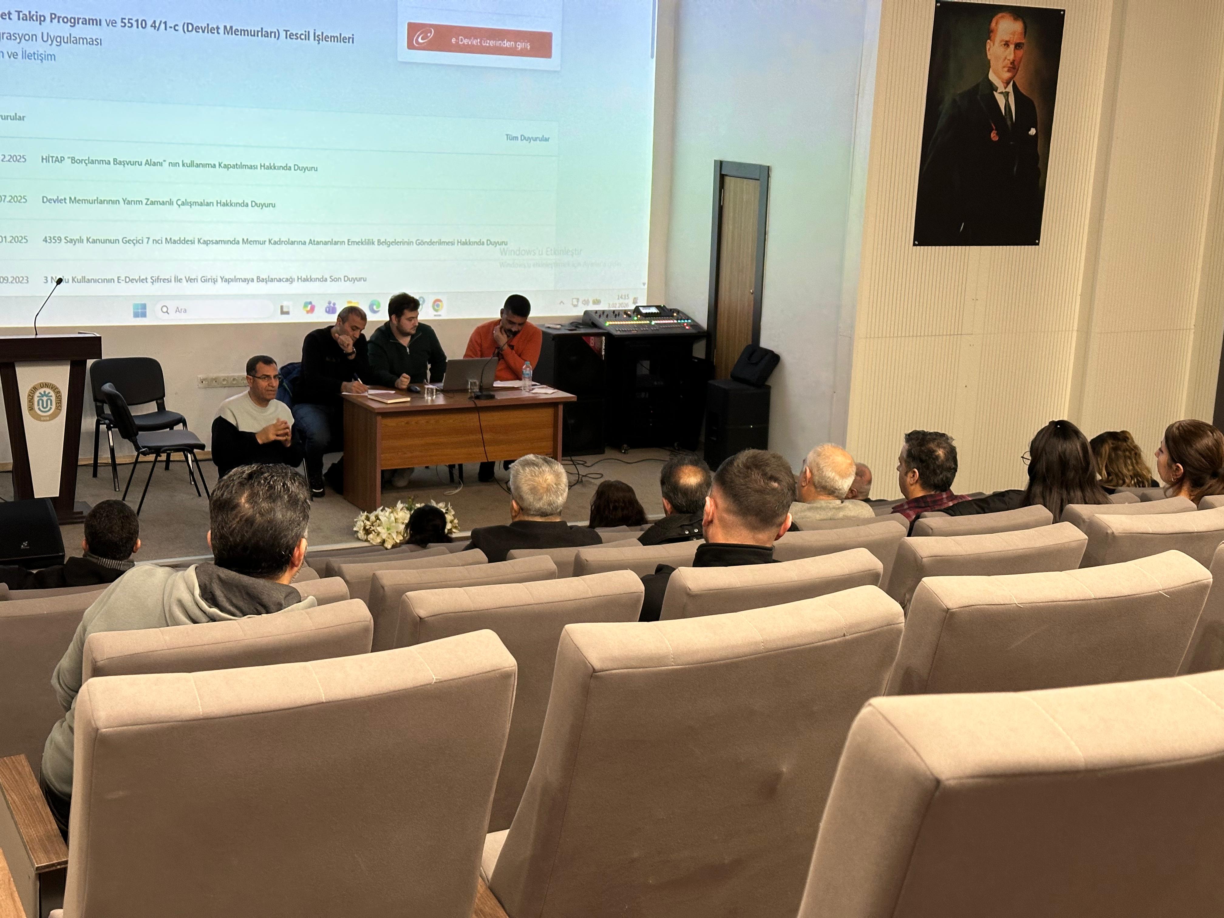 Başkanlığımız tarafından, kurumsal işleyişin daha etkin ve verimli yürütülmesi amacıyla Daire Başkanımız Ahmet YILMAZ, İdari Mali İşler Şube Müdürü Orhan NAKIŞ, Personel İdari Atama Biriminden Haydar ERDOĞAN ve Ahmet Bedirhan KAYA tarafından Üniversitemiz Akademik ve İdari Birimlerine personel mevzuatı, HİTAP sistemine veri girişleri, emeklilik, özlük işlemleri ve uygulamada karşılaşılan güncel konular hakkında eğitim verildi.