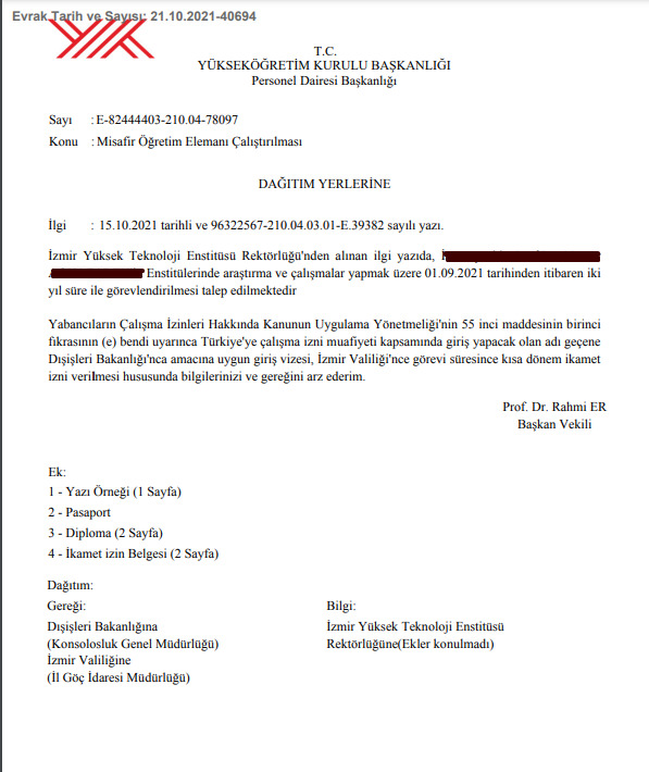 * Yükseköğretim Kurulu Başkanlığının Misafir Öğretim Elemanı Çalıştırılması konulu 21 Ekim 2021 tarihli yazısı |