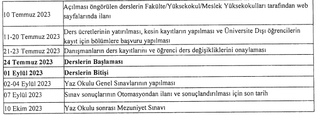 Not : Başvurular yaz okulu akademik takvimimizde belirtilen tarihlerde ilgili akademik birimlerin bölüm/program başkanlıklarına yapılacaktır.