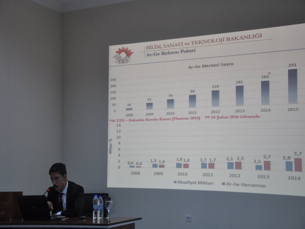 Bilim Sanayi Teknoloji Bakanlığı uzmanlarından Ahmet Gergerli tarafından katılımcılara yeni ARGE reforma paketi ile 2023 hedefleri çerçevesinde üniversite ve sanayicilere sağlanan destekler hakkında bilgiler verilerek, katılımcıların soruları cevaplandırıldı.