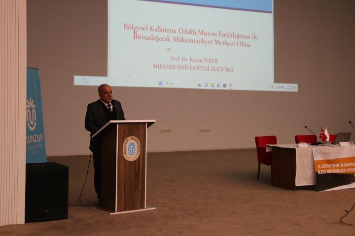 Akabinde kürsüye davet edilen Munzur Üniversitesi Rektörü Prof. Dr. Kenan Peker konuşmasına, Bölgesel Kalkınma Misyon Farklılaşması kapsamında Tunceli ilinde hangi alanlarda ihtisaslaşabileceği konusunda yoğunlaştıklarını ifade etti. Bu bağlamda, bitkisel üretim, hayvansal üretim, su ürünleri, tıbbi aromatik bitkilerin üretimi, nadir toprak elementleri gibi temel başlıklar altında, Tunceli’nin tüm kaynaklarını geliştirme ve dönüştürmeye yönelik projeler olduğunu vurguladı. Tunceli’de yaşayan Alevi kültürünün önemine değinen Rektör Prof. Dr. Kenan PEKER, geleneksel işleme yöntemleri esaslı katma değeri yüksek ürünler üretme konusunda programlar üzerinde çalıştıklarını, Munzur Üniversitesi olarak hem stratejik hem de Üniversite bünyesinde kuramsal stratejiler belirlediklerini vurguladı. Tunceli’deki bitki üzerinde Endonezya, Malezya ve Japonya Üniversiteleri ile ortak çalıştıklarını belirten Rektörümüz Rektör Prof. Dr. Kenan PEKER: ‘’Ekonomide şu önemlidir: Kıt kaynakları olan alanlar varsa, yani Tunceli’de yaşayanlara bir ihtisas alanı bulmalıyız. Burada stratejik hammaddeler; toprak, su, bitki, tıbbi aromatik baharatlar, hayvan, hava, ateş, insan elementleri ele alınmıştır. İhtiyaçları karşılamak için projeler üreteceğiz. Bunu, başta eğitimle ve bilgilendirmeyle yapacağız’’. Tunceli tabiatı ile güzel bir şehir olduğunu, dağlarında gulik, mantar, ışkın, sarımsak, kenger mevsimine göre yetiştiğini ifade eden Rektör Prof. Dr. Kenan PEKER ayrıca yetişen böğürtlen ile birçok ürün elde edilebileceğini dile getirdi. Ayrıca arıcılığın Tunceli’de çok geliştiğini ve Munzur’da bu alanda çalışan 500 üzerindeki arıcılardan en az 5 kişinin dünyadaki ilk iyi beşlere girebileceğini vurguladı. Tunceli’de Ar-Ge deneme tarlalarıyla yeni bitkiler yetiştirebileceğini, ilçe ve köylerde yönetim bilişim sistemleri katkısıyla üretim yapılabileceğini dile getirirken, Munzur Üniversitesi’nde ‘Turizm Fakültesi’ açacaklarını ifade etti.