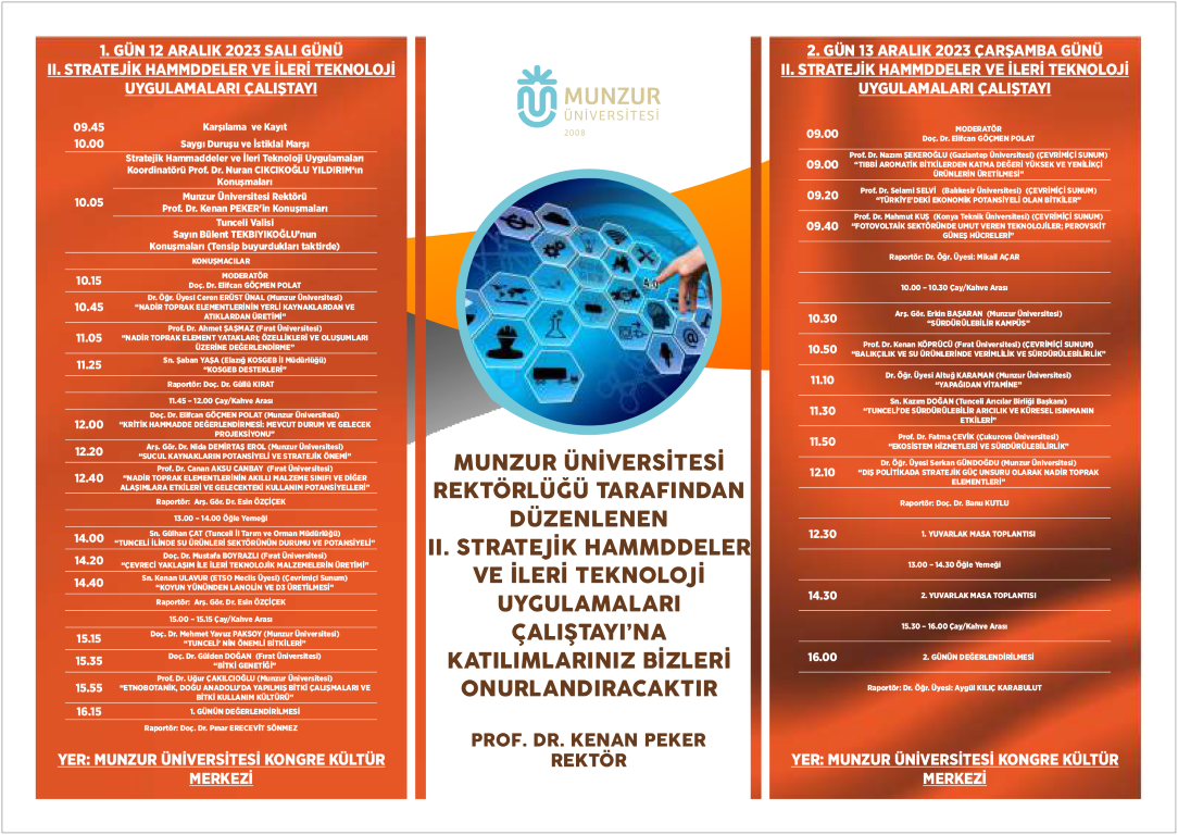Munzur Üniversitesi: 12 ve 13 Aralık 2023 yapılan II. Stratejik Hammaddeler ve İleri Teknoloji Uygulamaları Çalıştayı Munzur Üniversitesi Kongre Kültür Merkezinde düzenlendi. Su ürünleri, bitkisel üretim, nadir toprak elementleri, tıbbi aromatik bitkiler, hayvansal üretim ve sürdürülebilirlik konuların işlendiği çalıştayın açılış konuşmasını Munzur Üniversitesi Rektör Yardımcısı ve aynı zamanda Stratejik Hammaddeler ve İleri Teknoloji Uygulamaları Koordinatörü Prof. Dr. Nuran CIKCIKOĞLU YILDIRIM yaptı. Konuşmasında koordinatörlük bünyesinde yapılan çalışmaları bir sunum ile tanıtırken şunları söyledi: ‘‘2021 yılında, bölgesel kalkınma odaklı misyon farklılaşması kapsamında hammaddeler ve ileri teknoloji uygulamaları konusunda Munzur Üniversite’miz İhtisas Üniversitesi seçildi. Yükseköğretim Kurumları içerinde YÖK onayı ile ilk defa ‘’Nadir Toprak Elementleri Uygulama ve Araştırma Merkezi’ni biz kurduk. Üniversitemizde kurulan ihtisaslaşma koordinatörlüğüyle araştırma projelerinin startını verirken, eş zamanlı TÜBİTAK destekli projeleri de başlattık. Bunun yanı sıra İş Birliği Protokollerini; Saha İstanbul, Sektör Meclisi ve Fırat Üniversitesi’yle imzaladık. Tunceli Valiliği başkanlığında TRB1 Bölgesinde bulunan illerdeki Ticaret ve Sanayi Odaları, İl Sanayi ve Teknoloji Müdürlükleri, Organize Sanayi Müdürlükleri, Kalkınma Ajansı ve KOSGEB Müdürlüklerini kapsayan ‘Sektör Meclisi’ oluşturuldu. Munzur Üniversitesi; bölgemizde bulunan ve yüksek ihracat rakamlarına sahip kuruluşlarına bu alanda danışmanlık hizmeti yaparken, Stratejik hammaddeleri ve ileri teknoloji uygulamaları konusunda 3 öğrenciye YÖK doktora bursu desteği verilirken 14 öğrenci de Ar-Ge uygulaması kapsamında görevlendirilmiştir. Bu çalışmalarla sürdürülebilir ekonomik kalkınmayı; yoksulluğun bertaraf edilmesi, sağlık ve eğitimin iyileştirilmesi hedeflenmektedir. İklim değişikliğinin yaşandığı dünyamızda Ar-Ge çalışmaları çerçevesinde Tunceli krom maden ocaklarının karsal ve su ortamına etkileri ve Eko turizmin Tunceli ve Ulusal Park ilan edilen Munzur havzasının üzerindeki etkileri üzerinde çalışılacaktır’’.