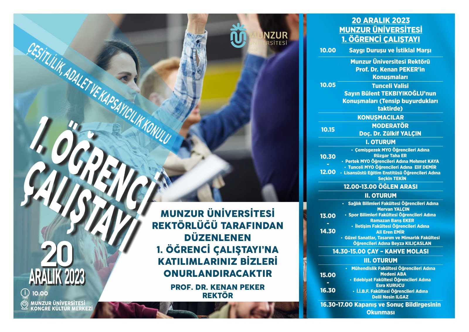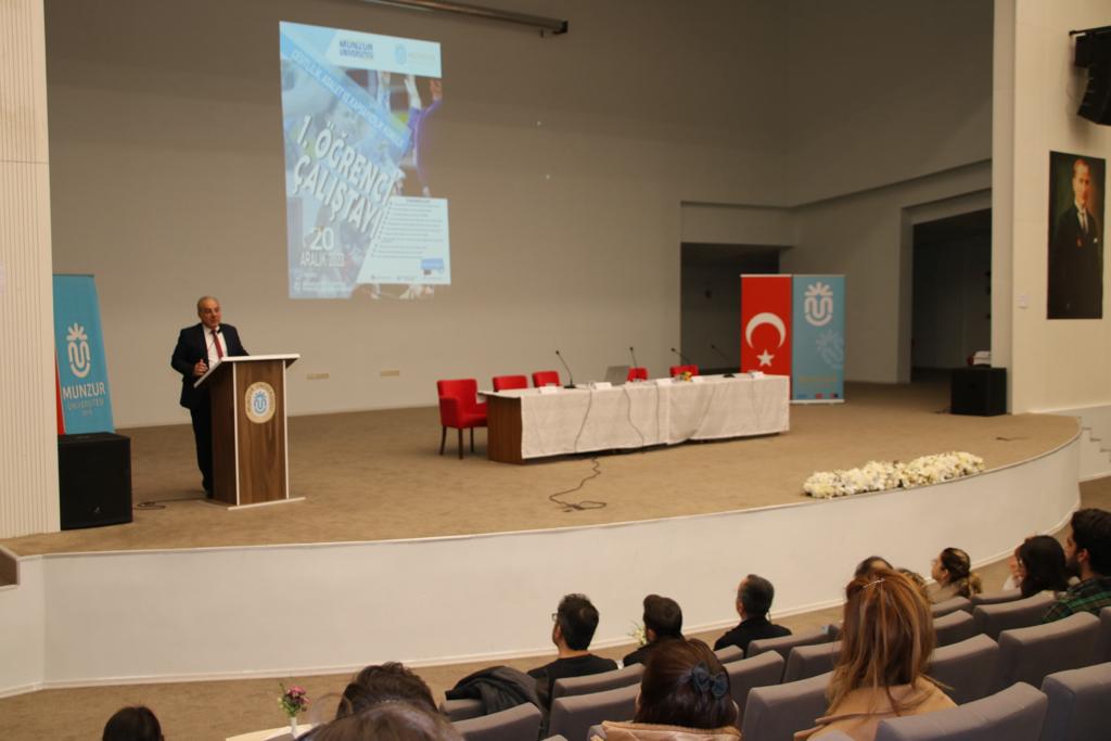 Munzur Üniversitesi 1. Öğrenci Çalıştayı 20 Aralık 2023 tarihinde Kongre Kültür Merkezinde gerçekleşti. Üç oturum şeklinde gerçekleşen Çalıştay saat 10.00 da Saygı duruşu ve İstiklal Marşı ile başladı. Munzur Üniversite Rektörü Prof. Dr. Kenan PEKER, Munzur Üniversite Rektör Yardımcıları Prof. Dr. Nuran CIKCIKOĞLU YILDIRIM ve Prof. Dr. Mustafa Taner ŞENGÜN, Munzur Üniversitesi Fakülte dekanları ve davetli konuklar katıldılar. Açılış konuşmasını yapan Rektörümüz Prof. Dr. Kenan PEKER; 1. Öğrenci Çalıştay’ının çok önemli olduğunu, Munzur Üniversitesi öğrencilerinin yaptıkları veya yapacakları önerilere hep açık olacaklarını ve Munzur Üniversite olarak iyi bir Eğitim-Öğretim için canla başla çalıştıklarını, var olan sorunları teker teker çözeceklerini belirtti.