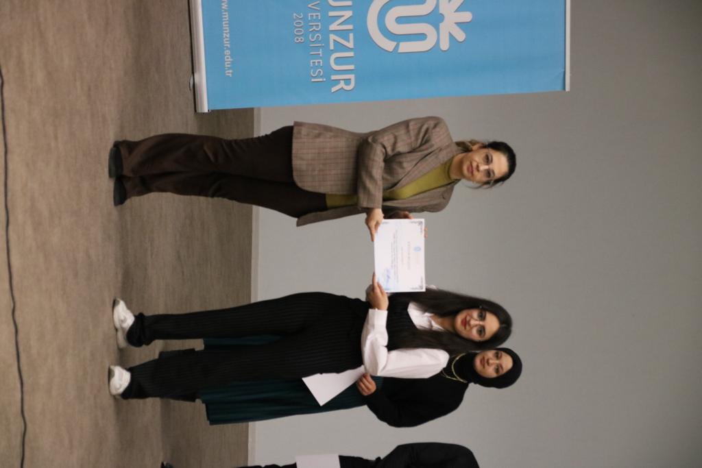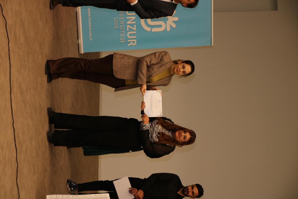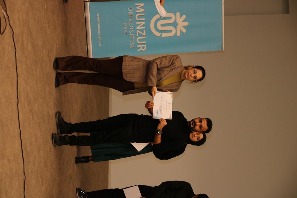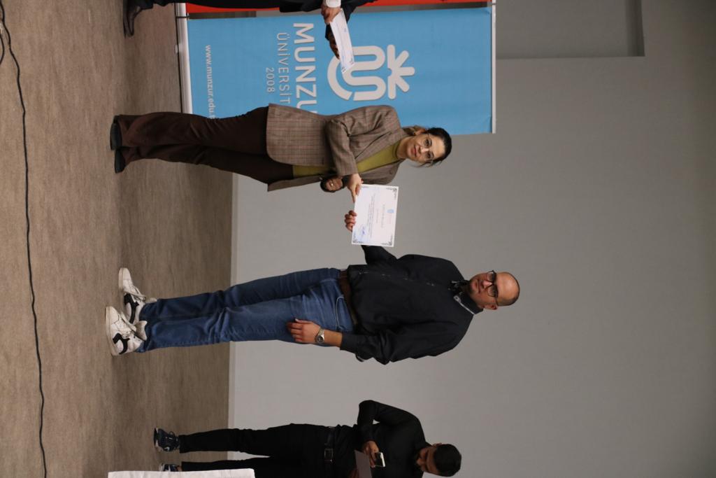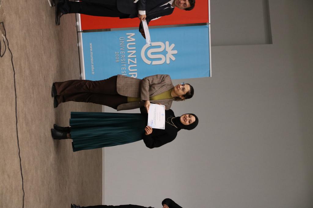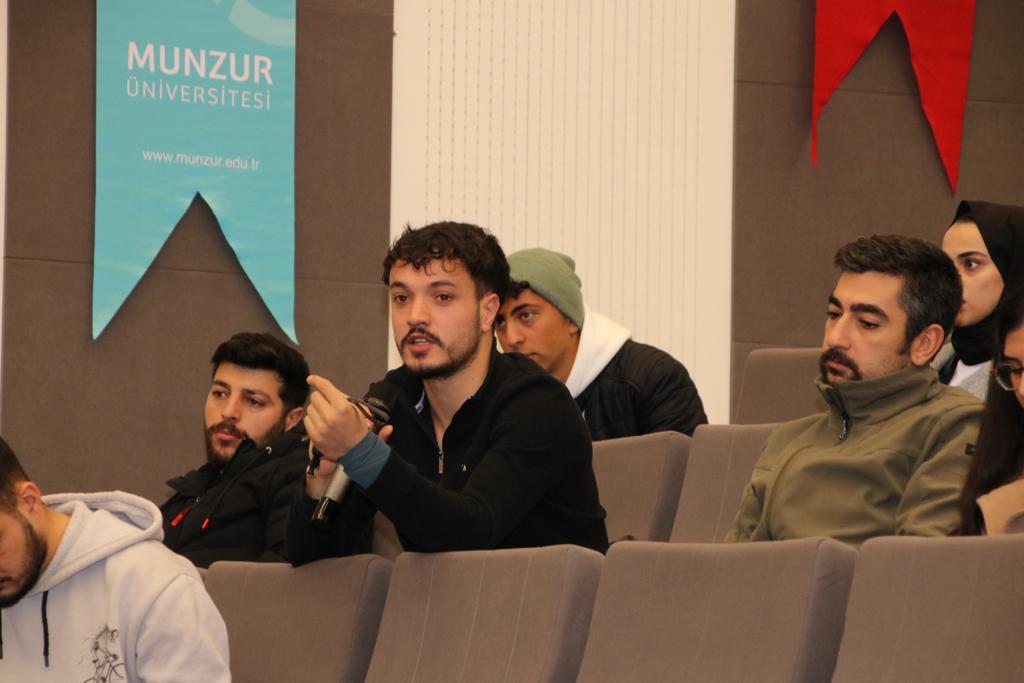 Akabinde 1. Öğrenci Çalıştayı Munzur Üniversite öğrencilerinin temsili konuşmaları başladı. 1. Öğrenci Çalıştay’ında Munzur Üniversite’si Fakültelerini Edebiyat Fakültesi’nden Esra KURUCU, Güzel Sanatlar Tasarım ve Mimarlık Fakültesi’nden Beyza KILIÇASLAN, İletişim Fakültesi’nden Ali Eren EMİR, İktisadi ve İdari Bilimler Fakültesi’nden Delil NESİN, Mühendislik Fakültesi’nden Medeni ABA, Sağlık Bilimleri Fakültesi’nden Mervan YALÇIN ve Spor Bilimleri Fakültesi’nden Ramazan Barış EKER öğrencileri birer konuşma yaparken, aynı şekilde Lisansüstü Eğitim Enstitüsü öğrencilerini temsilen Seçgin TEKİN, Munzur Üniversitesi’nin Meslek Yüksek Okul (MYO) öğrencilerini temsilen Elif DEMİR, Çemişgezek Meslek Yüksek Okulu (MYO) öğrencilerini temsilen Rüzgar Taha ER, Pertek Meslek Yüksek Okulu (MYO) öğrencilerini temsilen Mehmet KAYA birer konuşma gerçekleştirdiler. Öğrenciler konuşmalarında bünyesinde eğitim gördükleri fakülte ve bölümlerindeki sorunları sundular. Konuşmalarında iyileştirme taleplerini de dile getiren öğrenci temsilcileri özellikle ulaşım ve yurtlardaki eksikliklerinin ivedikle giderilmesini talep ettiler. Programın moderatörlüğünü Dr. Öğr. Üyesi Zülkif YALÇIN yaptı. Rektör Yardımcısı Prof. Dr. Nuran CIKCIKOĞLU YILDIRIM tarafından Öğrenci Çalıştay’ını düzenlenmesinde emek veren öğrenci temsilcilerine katılım belgesi verildi.