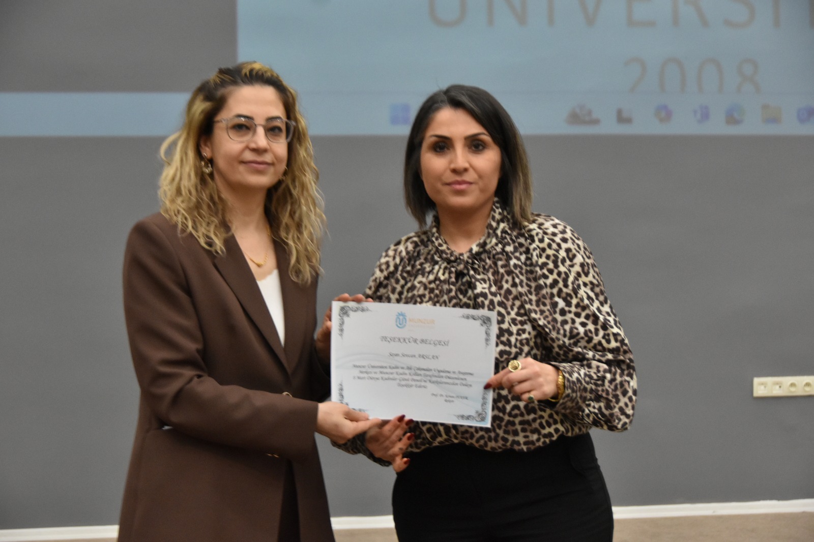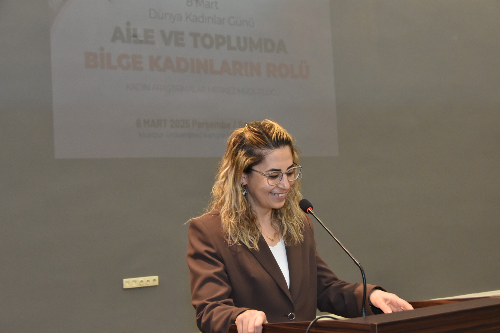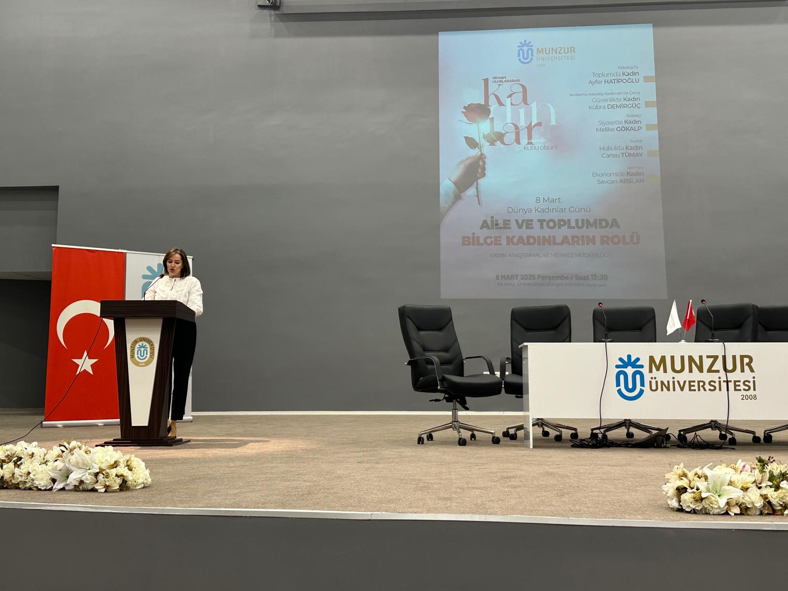 Munzur Üniversitesi Rektör Yardımcısı Prof. Dr. Nuran CIKCIKOĞLU YILDIRIM yaptığı konuşmada 2025 yılı Cumhurbaşkanı Recep Tayyip Erdoğan’ın tensipleri ile “Aile Yılı” ilan edildiğini ve Kadınların tarih boyunca yaşamın her alanında var olan; üreten, yöneten, bilimde, sanatta, siyasette, ekonomide ve eğitimde büyük katkılar sunduğunu, ancak güçlü temsili için önemli adımlar atılmış olsa da hala gidilmesi gereken uzun bir yolun olduğunu vurguladı. Diğer yanıyla Kadının iş hayatında yerini alması ekonomik kalkınmanın temel taşlarından biriyken, eğitimde fırsat eşitliği sayesinde desteklenen her kız çocuğunun geleceğin güçlü bir bilim insanı, sanatçısı, politikacısı ya da girişimcisi olabileceğini ifade eden Munzur Üniversitesi Rektör Yardımcısı Prof. Dr. Nuran CIKCIKOĞLU YILDIRIM; Uluslararası 8 Mart Dünya Kadınlar Günü sadece bir kutlama değil, aynı zamanda farkındalık yaratma, mücadeleyi sürdürme ve adil bir toplum inşa etme günü olduğunu belirtti ve programı düzenleyen Munzur Üniversitesi Kadın ve Aile Çalışmaları Uygulama ve Araştırma Merkezi Müdürü Öğr. Gör. Dr. Nida PLATİN’e, Dr. Öğr. Üyesi Ayşe Esra PEKER’e, tüm konuşmacı panelistlere ve katılımcılara teşekkür etti.