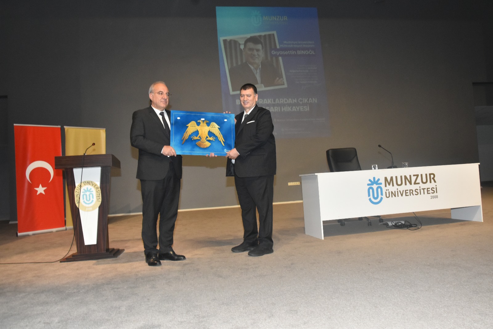 Etkinlik sonunda Rektörümüz Prof. Dr. Kenan PEKER, Gıyasettin BİNGÖL’ün gençler için önemli bir rol model olduğunu ifade ederek, katılımlarından dolayı kendisine anlamlı bir hediye takdim etti.